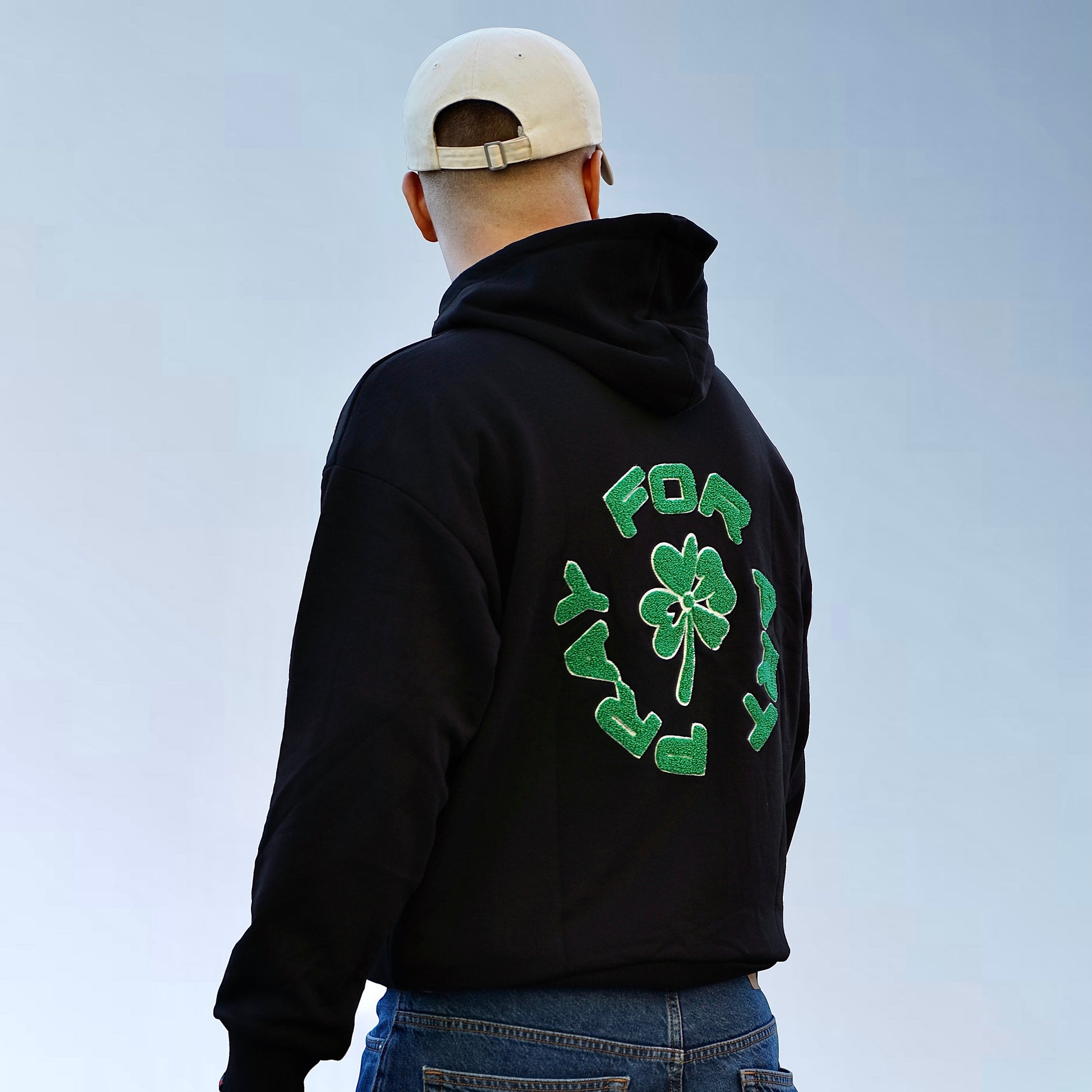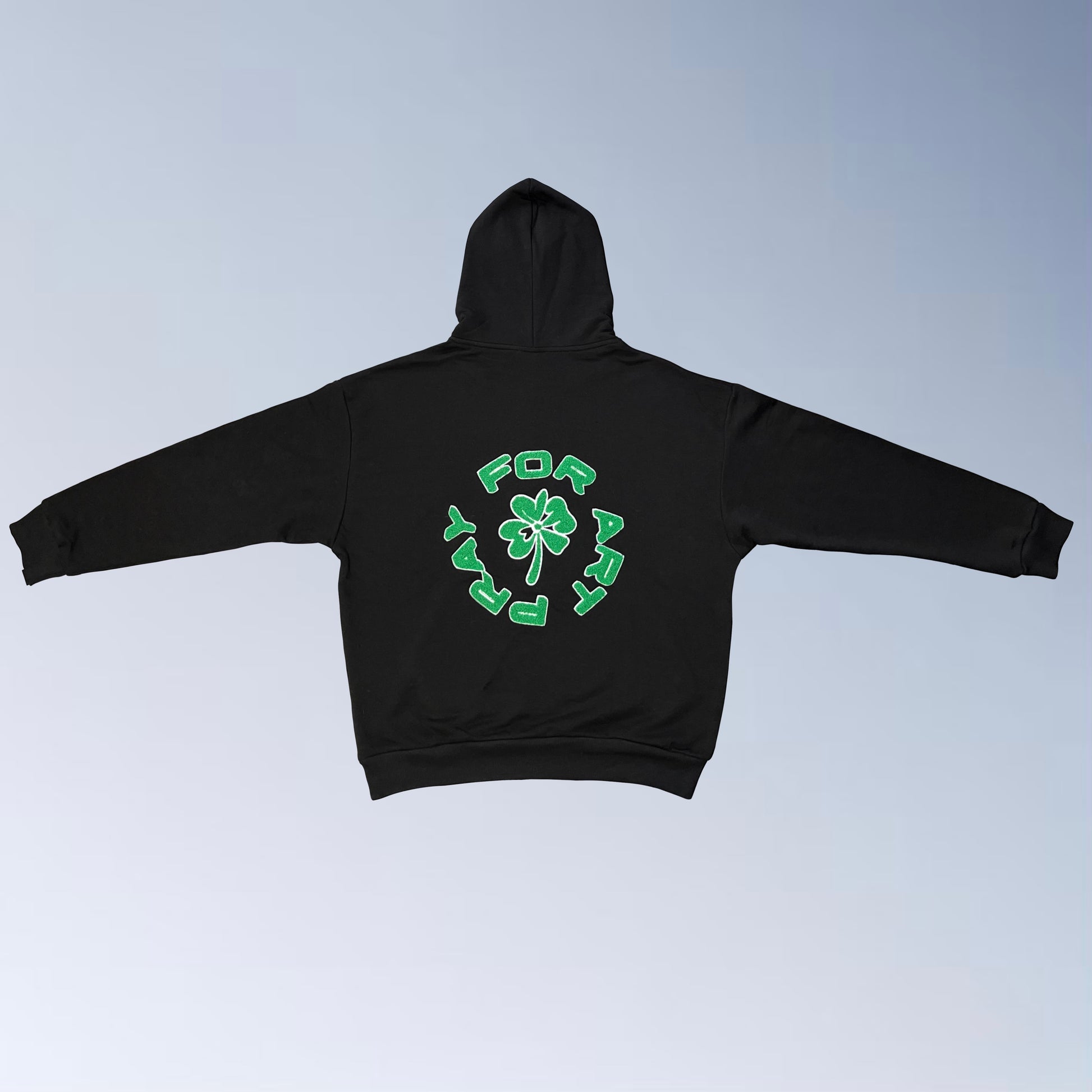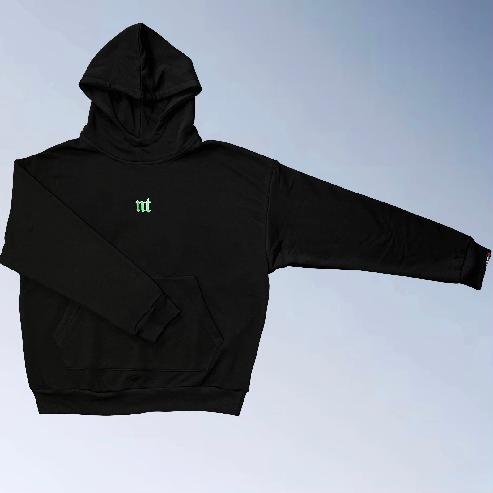 Unisex PRAY FOR ART Hoodie in Black, featuring green Chenille “Pray for Art” Design on the Back and iconic green “nt” embroidered logo on the front. Dropped shoulders, Special crewneck and hood, without drawstring and has flattering Boxy fit.